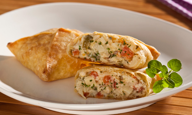 Coloque uma porção de recheio sobre cada quadrado de massa folhada e feche como uma trouxinha.